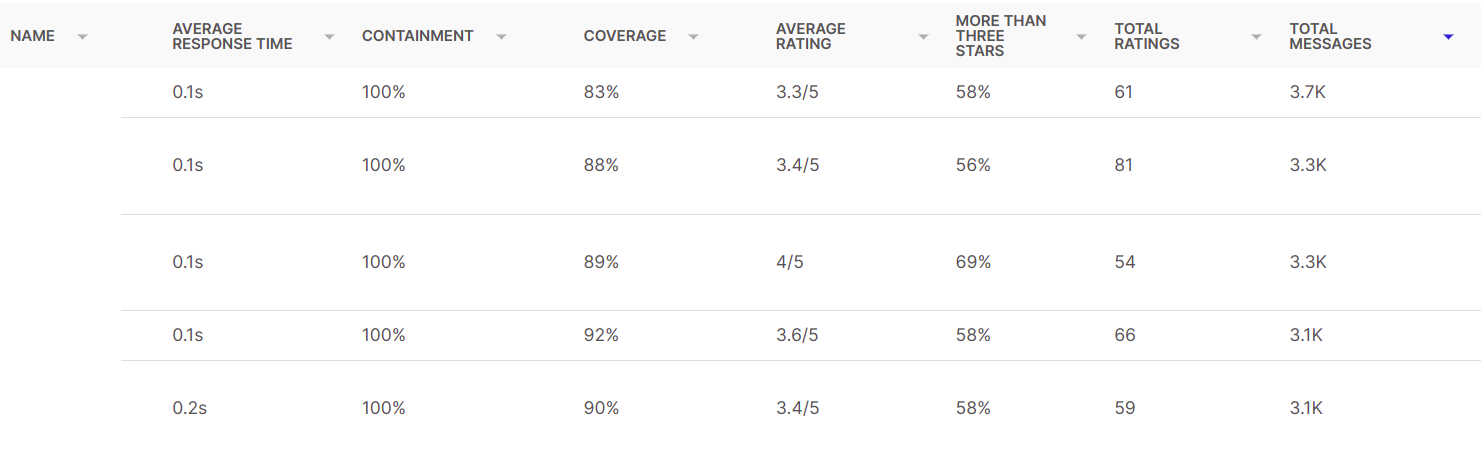 The AI Agent performance table contains similar information to the live agents' one, as well as containment and coverage percentages.