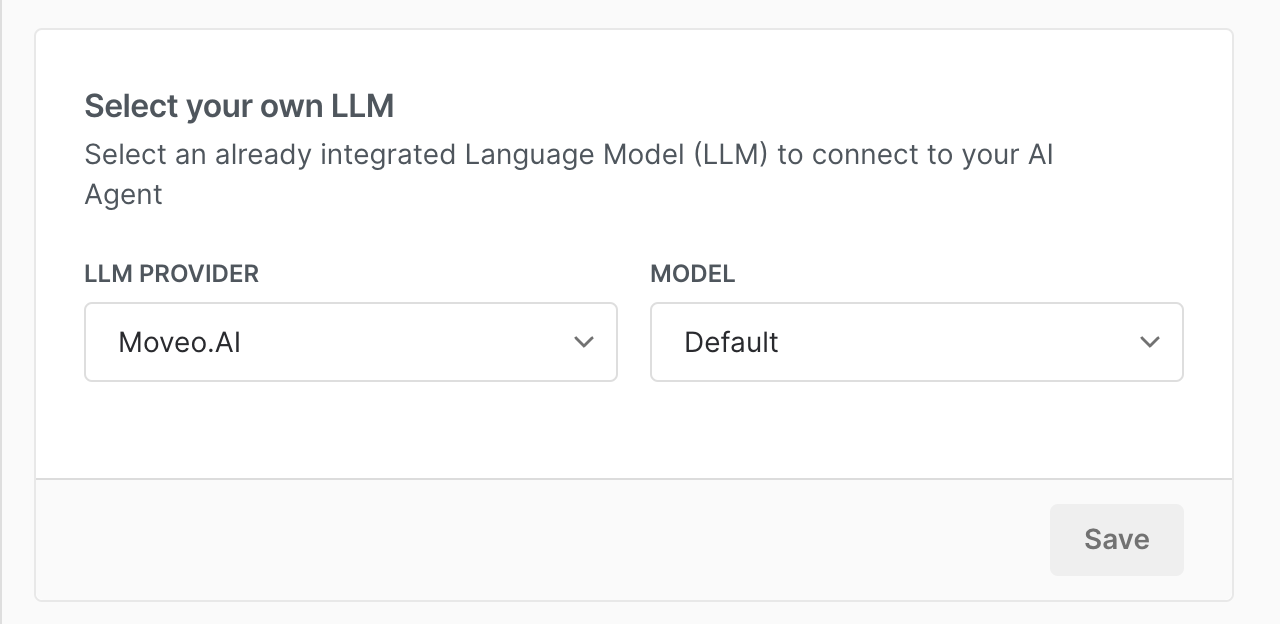 - LLM Provider: Select an available provider (e.g., Moveo.AI, OpenAI, Azure OpenAI, Anthropic, Gemini, DeepSeek).