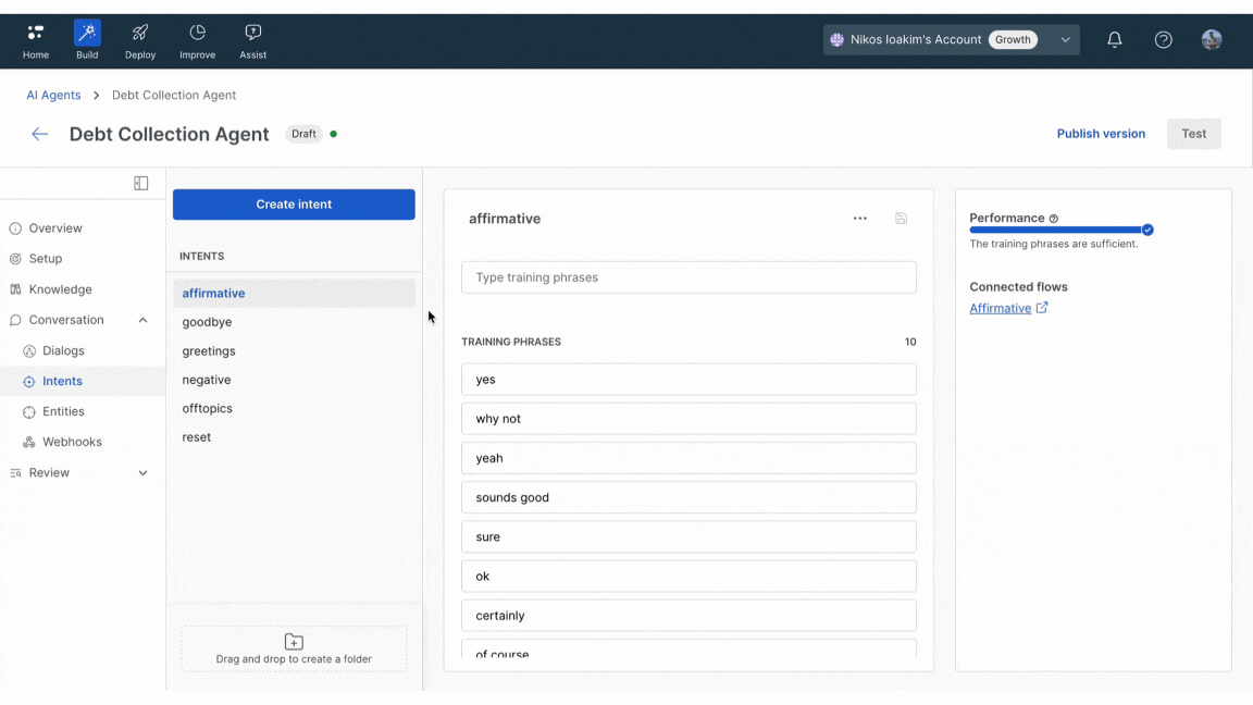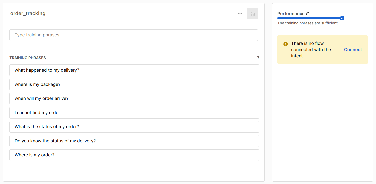 When building intents for your AI agent, it is important to consider the intent performance. While around 6-10 natural language examples per intent are considered optimal, you should maintain a balance between the number of phrases and the overall performance. The performance bar on the right sidebar can give you a good idea of how well your intent will perform, because it takes into consideration the number of training phrases you have provided for the intent, as well as how they compare to the other intents in the AI agent.
