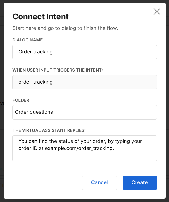 by clicking on Connect. Pick a name for your new dialog, as well as the folder you want to classify it. Then, write the reply of the assistant, click Create and modify the dialog to your needs.- Connect flow