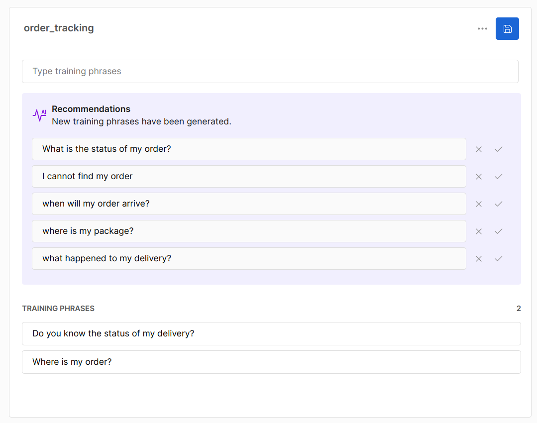 Once you input your initial set of examples, Moveo will use them to suggest additional examples that are relevant to your intent. You can then accept or reject these suggestions based on their suitability. The following example illustrates this process: After entering the first two training phrases, Moveo generates new phrases, and you can choose which ones to incorporate into your intent by accepting them.