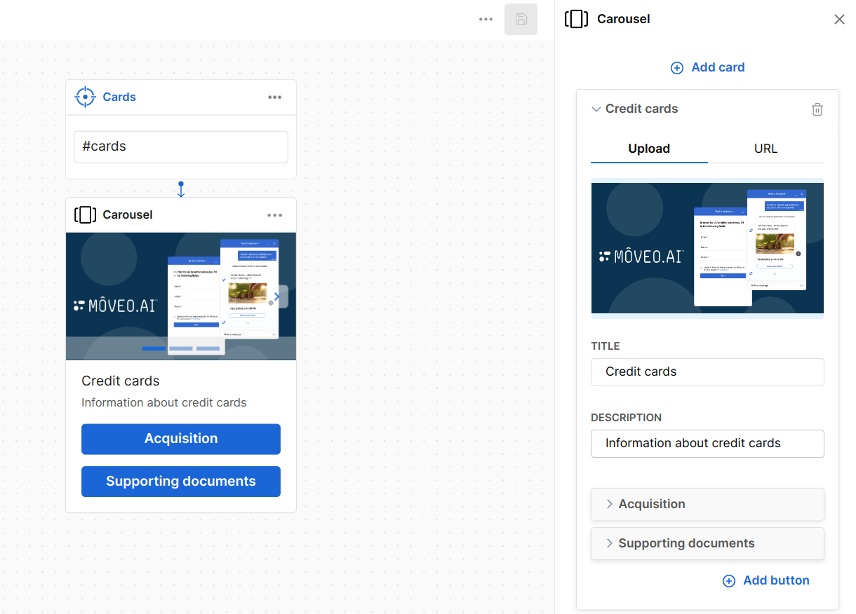buttons: Each card must have at least one and up to three buttons, formatted as follows:label: The text displayed on the button.type: Can bepostback,url,webview, orphone.value: The value associated with the button type.