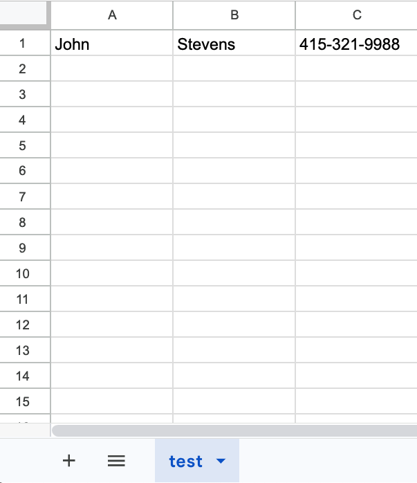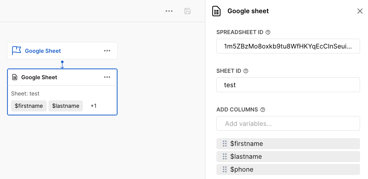 The Google Sheet action contains the following three fields: