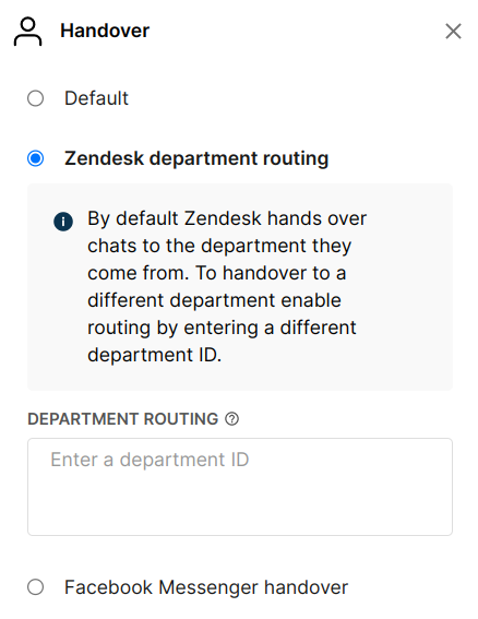 You can choose which Zendesk department handles the conversation when the handover action is triggered. To do this, copy the department ID from the Zendesk integration settings and paste it into the department_routing field of the handover action in the dialog.