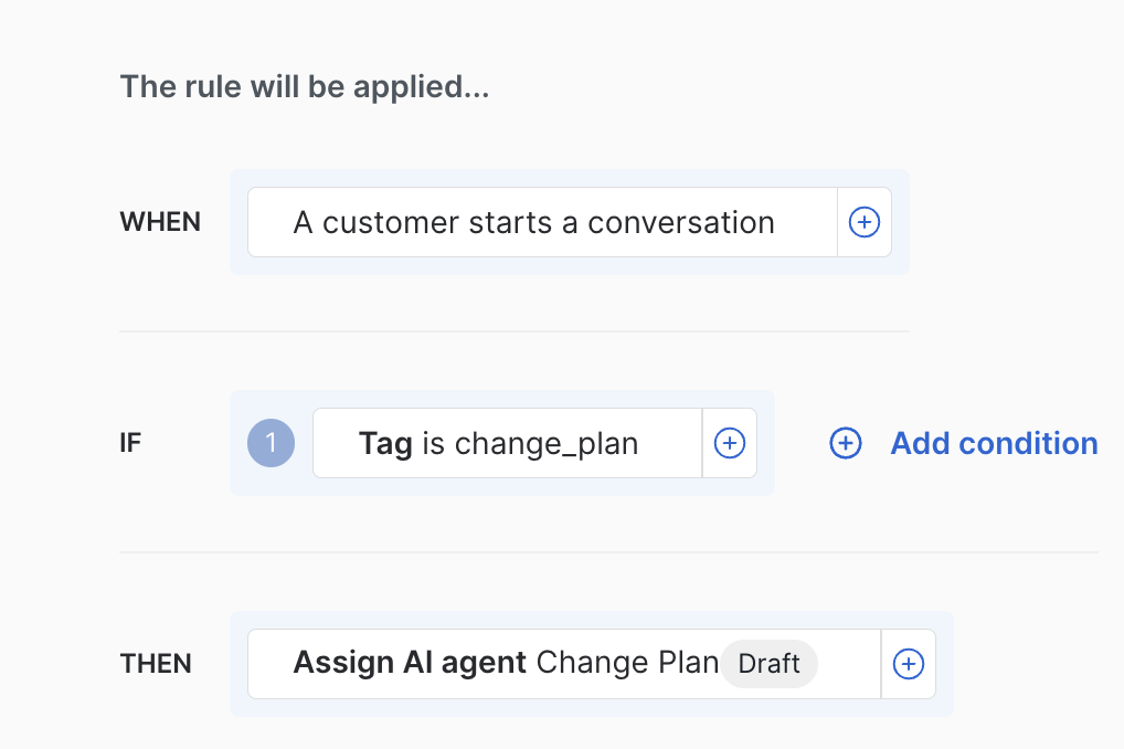 Follow the same steps as the previous rule, but set the If field to Tag is change_plan and the Then field to Assign to Agent and select the Change plan Agent.