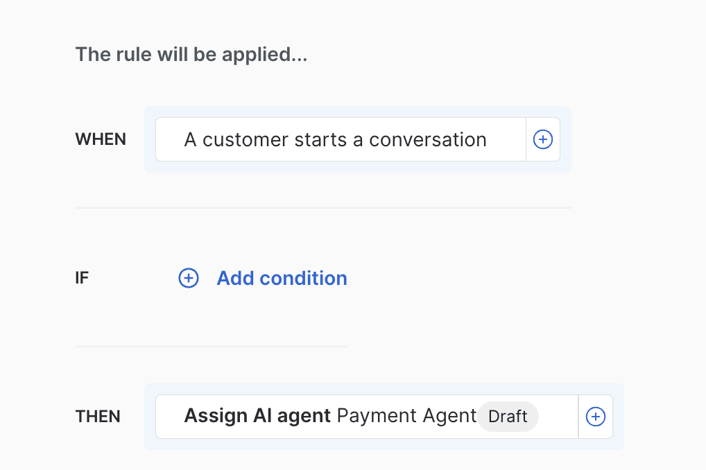 Now that we have our dialog ready, we need a way to connect the Agent to the user. First, we must create a rule that will assign the conversation to the Upsell Agent. This rule will be triggered when the user starts a conversation. Then, we will create a second rule that will assign the conversation to the Change plan Agent when the tag change_plan is evaluated.