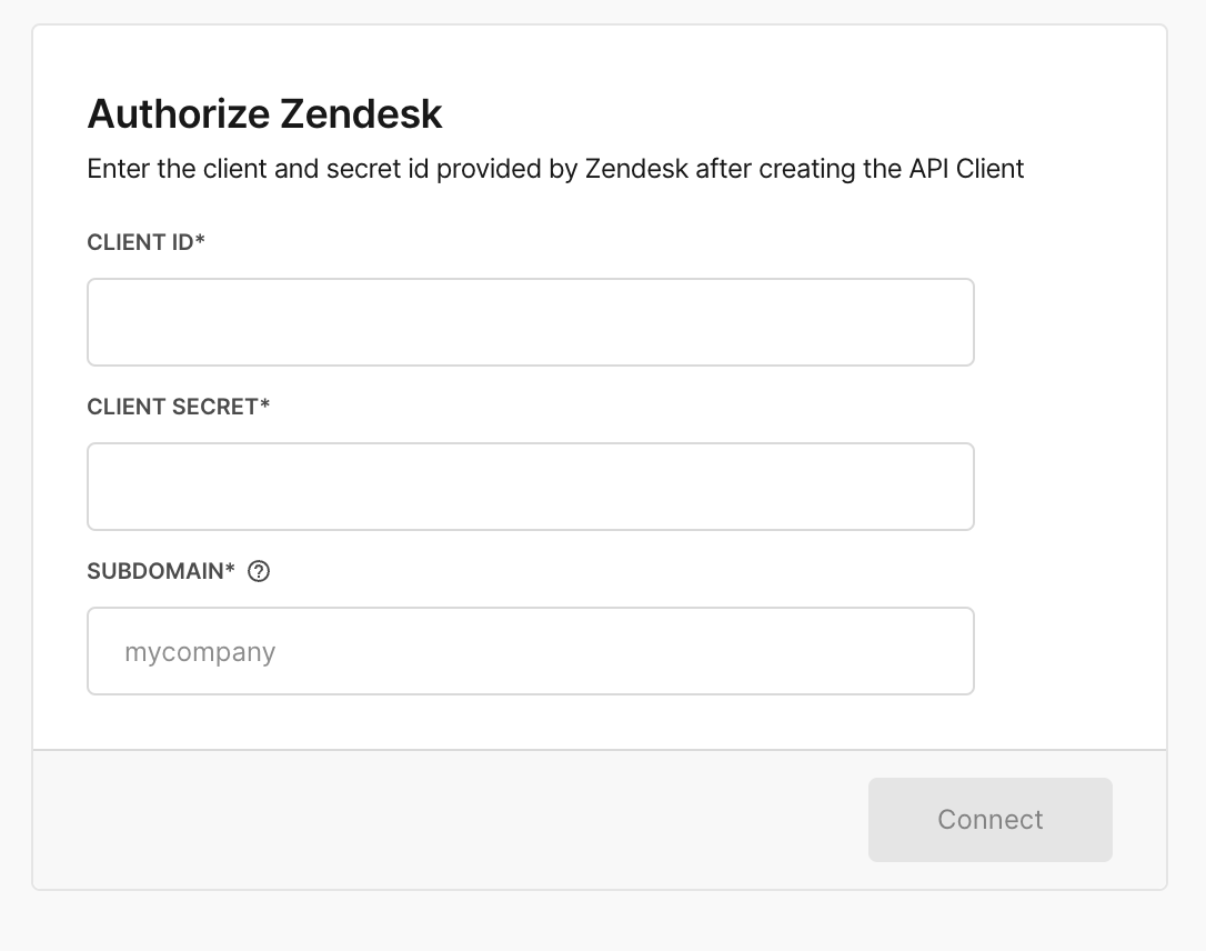- Copy the Client ID, Client Secret, and Subdomain from the authorization details into the Authorize Zendesk section.