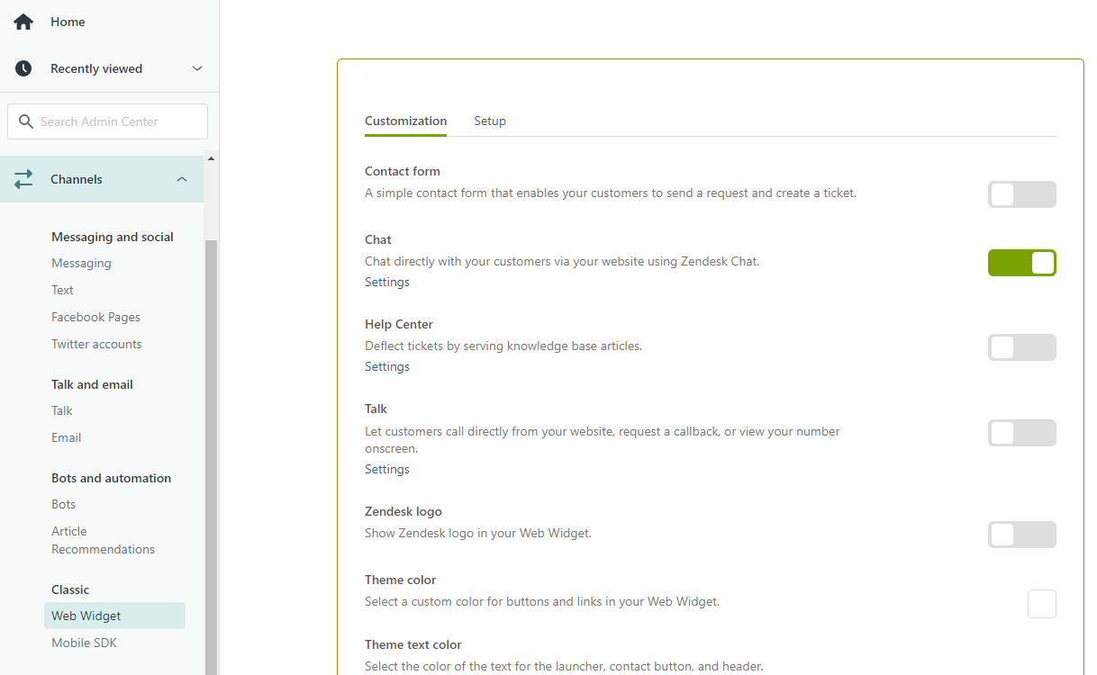 Go to Admin Center → Channels → Web Widget (Classic) and enable the Chat setting.